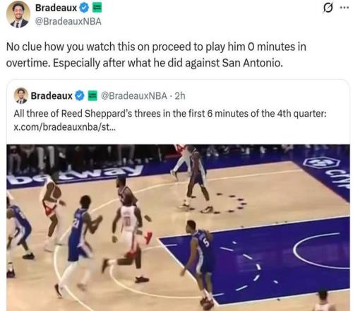 其中Bradeaux連發數條消息,先是稱贊了謝潑德的表現,然后對謝潑德末節遭遇DNP感到不可思議:“我完全不明白你們(火箭教練組)在搞些什么東西,加時賽居然一分鐘都不讓謝潑德打,尤其是上一場對陣馬刺他交出如此火爆表現之后。”