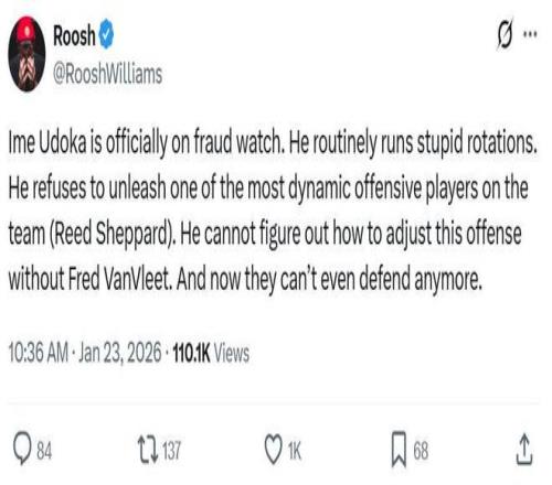 因此火箭播客主持人Roosh Williams在烏度卡給出理由后依舊怒噴到:“烏度卡已經被正式列入欺詐名單,他經常擺出愚蠢的輪轉陣容,拒絕讓隊中最有進攻活力之一的謝潑德登場,沒有范喬丹,他根本不知道如何調度進攻,甚至現在連防守也沒有了。”