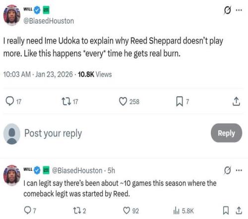 火箭媒體人Will更是發文直接點名烏度卡,表示自己真得需要烏度卡解釋一下,為什么謝潑德登場機會這么少,而且每一次都是在其狀態火熱時發生,火箭隊本賽季差不多有8-10場被逆轉的比賽是從謝潑德使用出問題開始的。